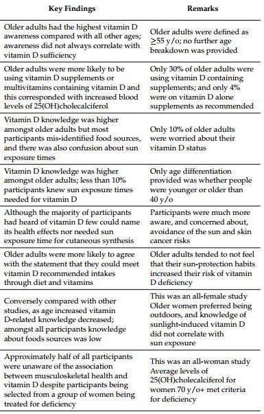 The following are just the right columns of Table 1Autonomy and mobility are, in many cases, key elements underlying positive ageing. Vitamin D (vitD) is essential to maintaining musculoskeletal health and hence mobility; ensuring adequate vitD status is important in positive ageing. However, vitD deficiency persists in ~10–30% of older adults in the Western world. The aim of this review was to explore older adult vitD beliefs, knowledge and preferences, in order to identify means to prevent vitD deficiency respectful of older peoples’ autonomy. Academic search-engines were used to explore the research literature with the keywords: vitamin D; older adults; preferences; knowledge; practices; beliefs. 22 recent studies were identified; although the majority of older people knew of vitD, knowledge about increased fall risk secondary to deficiency was limited and knowledge did not always correlate with adequate intake or status.