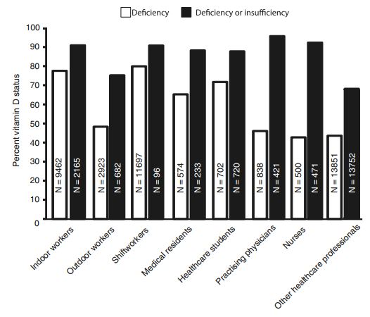 Rates of vitamin D deficiency among healthcare professionals were: healthcare students 72%, medical residents 65%, practising physicians 46%, other healthcare employees 44%, and nurses 43%. Combined rates of vitamin D deficiency or insufficiency (25-(OH)D < 75 nmol/L) were very high in all investigated groups.