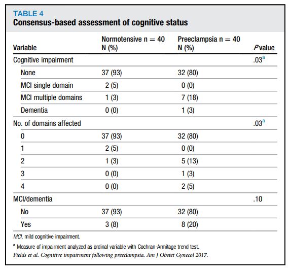 The aim of this study was to examine whether women with a history of preeclampsia were at increased risk of cognitive decline 35-40 years after the affected pregnancy.