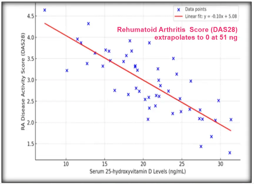 - Rheumatoid Arthritis score extrapolates to zero at 51 ng of Vitamin D (India) – June 2024