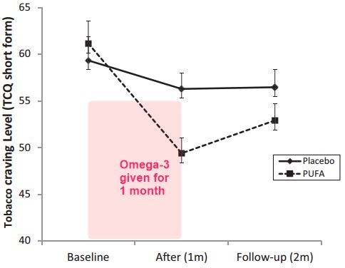 Effects of omega-3 fatty acids on tobacco craving in cigarette smokers: A double-blind, randomized, placebo-controlled pilot study.