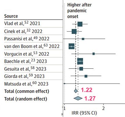 Results Forty-two studies including 102 984 incident diabetes cases were included in the systematic review. The meta-analysis of type 1 diabetes incidence rates included 17 studies of 38 149 youths and showed a higher incidence rate during the first year of the pandemic compared with the prepandemic period (incidence rate ratio [IRR], 1.14; 95% CI, 1.08-1.21). There was an increased incidence of diabetes during months 13 to 24 of the pandemic compared with the prepandemic period (IRR, 1.27; 95% CI, 1.18-1.37). Ten studies (23.8%) reported incident type 2 diabetes cases in both periods. These studies did not report incidence rates, so results were not pooled. Fifteen studies (35.7%) reported DKA incidence and found a higher rate during the pandemic compared with before the pandemic (IRR, 1.26; 95% CI, 1.17-1.36).