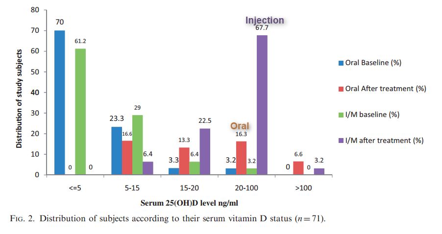 "injectable form was shown to be statistically significant" Can request full text at ResearchGate - Treatment of Hypovitaminosis D With Pharmacologic Doses of Cholecalciferol, Oral vs Intramuscular Medscape 2013