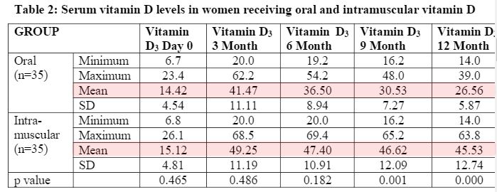 Baseline clinical characteristics and 25(OH) vitamin D levels were comparable in both the groups. Post treatment 25(OH) vitamin D level in- group I was 26.06 ± 9.06 ng/ml and in