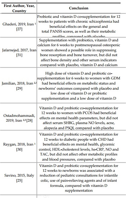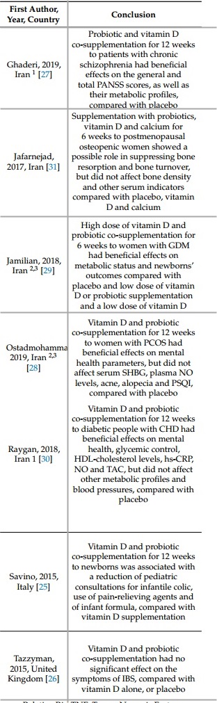 Studies were excluded if they were non-randomized, uncontrolled, involving participants taking medication known to influence vitamin D metabolism or with conditions affecting vitamin D metabolism such as chronic kidney disease, chronic liver disease, or malabsorption states, or entailing a supplementation with either vitamin D or probiotics.