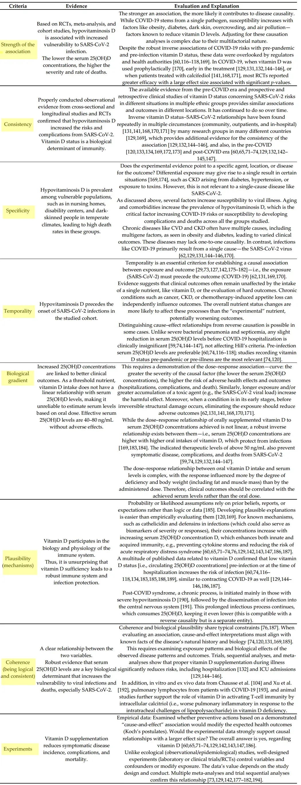 Sunil J. Wimalawansa – Endocrinology and Human Nutrition, CardioMetabolic & Endocrine Institute, North Brunswick, NJ 08902, USAClinical trials consistently demonstrate an inverse correlation between serum 25-hydroxyvitamin D [25(OH)D; calcifediol] levels and the risk of symptomatic SARS-CoV-2 disease, complications, and mortality. This systematic review (SR), guided by Bradford Hill’s causality criteria, analyzed 294 peer-reviewed manuscripts published between December 2019 and November 2024, focusing on plausibility, consistency, and biological gradient. Evidence confirms that cholecalciferol (D3) and calcifediol significantly reduce symptomatic disease, complications, hospitalizations, and mortality, with optimal effects above 50 ng/mL. While vitamin D requires 3–4 days to act, calcifediol shows effects within 24 h. Among 329 trials, only 11 (3%) showed no benefit due to flawed designs. At USD 2/patient, D3 supplementation is far cheaper than hospitalization costs and more effective than standard interventions. This SR establishes a strong inverse relationship between 25(OH)D levels and SARS-CoV-2 vulnerability, meeting Hill’s criteria. Vitamin D3 and calcifediol reduce infections, complications, hospitalizations, and deaths by ~50%, outperforming all patented, FDA-approved COVID-19 therapies.