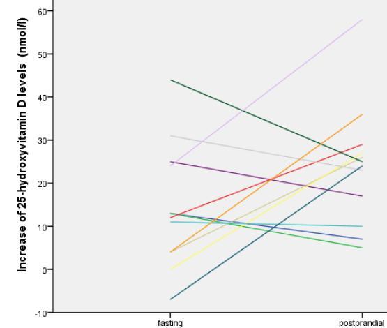 - 5 of the doctors had more response to vitamin D when taken after principal meal (rising lines in the above chart)