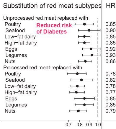 Greater consumption of red meat has been associated with a higher risk of type 2 diabetes mellitus (T2DM). A decreased intake of red meat and simultaneous increased intake of other high-protein foods may be associated with a lower risk of T2DM. These analyses of specific food replacements for red meat may provide more accurate dietary advice.
