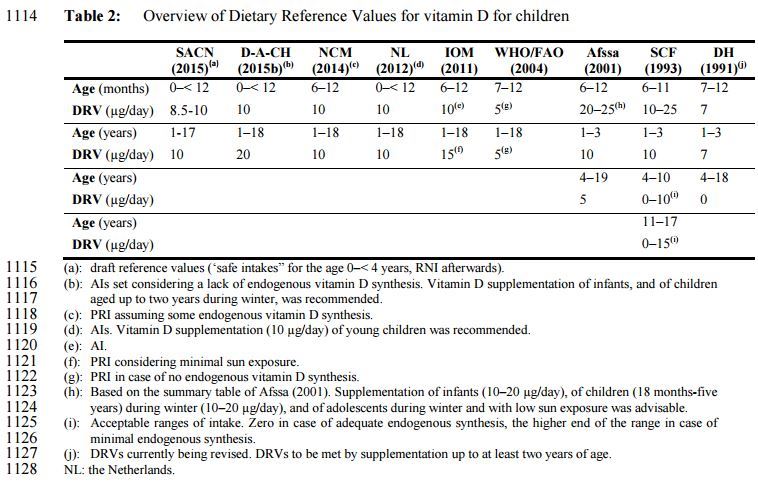 • For children aged 1-17 years, an AI for vitamin D is set at 15 ug/day, based on the meta-regression analysis.